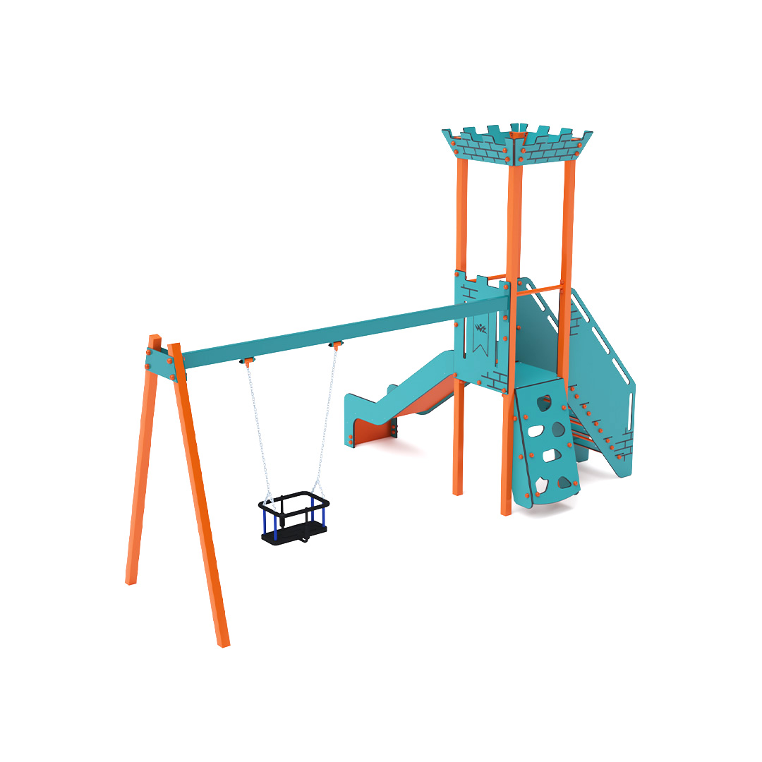 Single-tower combined mini playset – a tower with battlements that children can climb using the stairway and slide down via the slide. The turquoise-orange design invites play even from a distance. The steel structure is weather-resistant thanks to hot-dip galvanizing and a durable powder-coated finish. The HPL material used is chemically resistant, UV-stable – colorfast, non-toxic, recyclable, and unbreakable. This eliminates the risk of injury from sharp edges or fragments. All joints are made of stainless steel and covered with plastic caps to enhance durability and safety.