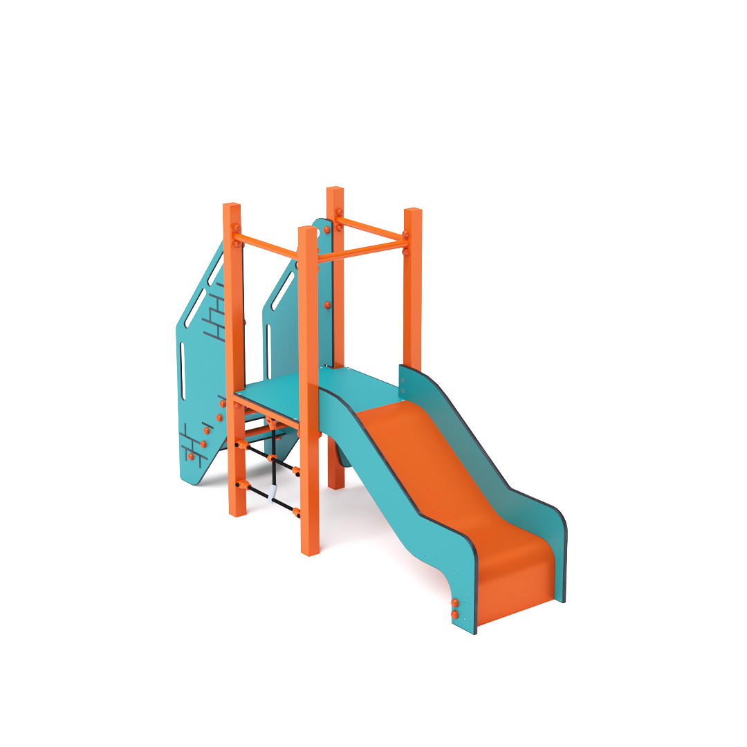 Single-tower combined mini playset – a tower with battlements that children can climb using the stairway and slide down via the slide. The turquoise-orange design invites play even from a distance. The steel structure is weather-resistant thanks to hot-dip galvanizing and a durable powder-coated finish. The HPL material used is chemically resistant, UV-stable – colorfast, non-toxic, recyclable, and unbreakable. This eliminates the risk of injury from sharp edges or fragments. All joints are made of stainless steel and covered with plastic caps to enhance durability and safety.
