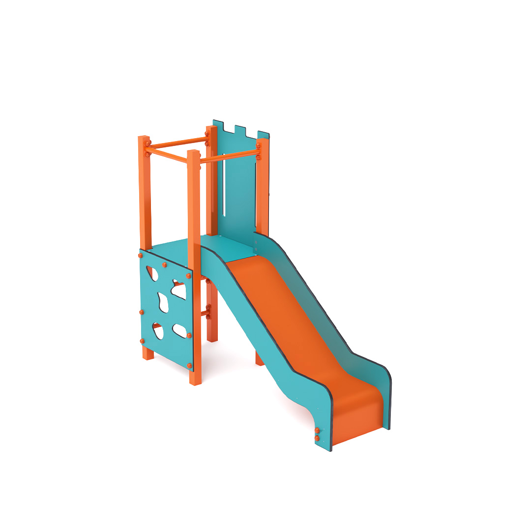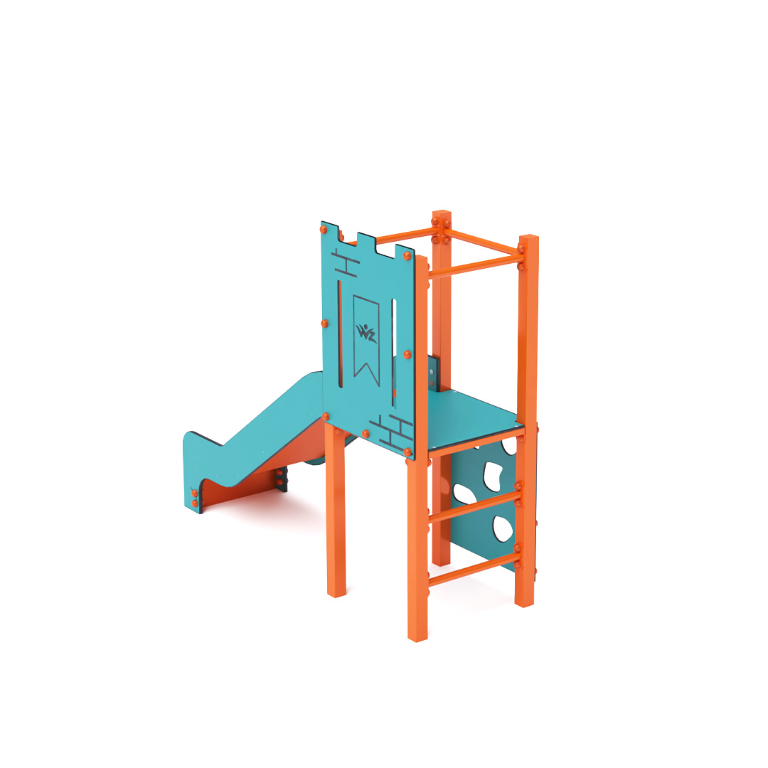 Single-tower combined mini playset – a tower with battlements that children can climb using the stairway and slide down via the slide. The turquoise-orange design invites play even from a distance. The steel structure is weather-resistant thanks to hot-dip galvanizing and a durable powder-coated finish. The HPL material used is chemically resistant, UV-stable – colorfast, non-toxic, recyclable, and unbreakable. This eliminates the risk of injury from sharp edges or fragments. All joints are made of stainless steel and covered with plastic caps to enhance durability and safety.
