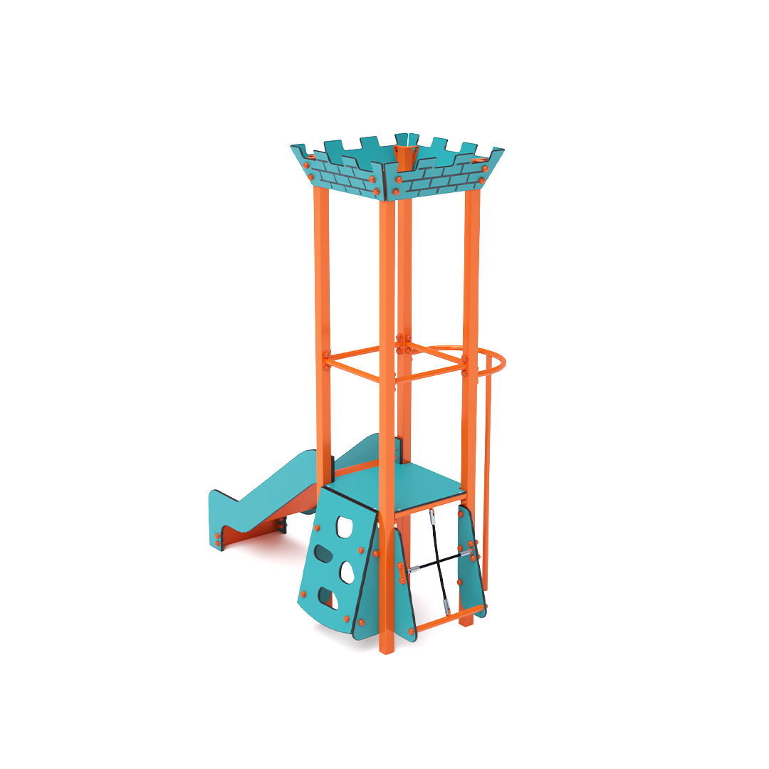 Single-tower combined mini playset – a tower with battlements that children can climb using the stairway and slide down via the slide. The turquoise-orange design invites play even from a distance. The steel structure is weather-resistant thanks to hot-dip galvanizing and a durable powder-coated finish. The HPL material used is chemically resistant, UV-stable – colorfast, non-toxic, recyclable, and unbreakable. This eliminates the risk of injury from sharp edges or fragments. All joints are made of stainless steel and covered with plastic caps to enhance durability and safety.