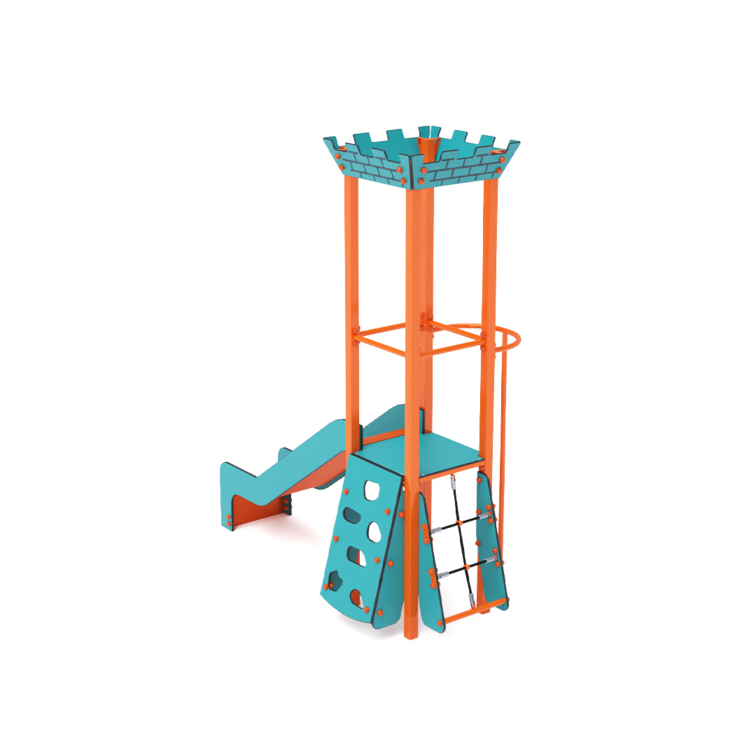 Single-tower combined mini playset – a tower with battlements that children can climb using the stairway and slide down via the slide. The turquoise-orange design invites play even from a distance. The steel structure is weather-resistant thanks to hot-dip galvanizing and a durable powder-coated finish. The HPL material used is chemically resistant, UV-stable – colorfast, non-toxic, recyclable, and unbreakable. This eliminates the risk of injury from sharp edges or fragments. All joints are made of stainless steel and covered with plastic caps to enhance durability and safety.