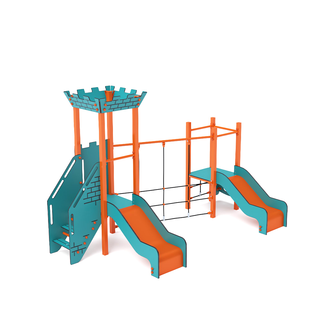 Two-tower combined mini playset. The towers are connected by a beam bridge. Children can access the playset via two inclined climbing walls and two vertical ladder climbs, and descend using two slides. The eye-catching turquoise-orange design invites children to play from afar. The steel structure is weather-resistant due to hot-dip galvanizing and a durable powder coating. The HPL panels are chemically resistant, UV-stable – colorfast, non-toxic, recyclable, and unbreakable, eliminating risks of injury from sharp edges or splinters. All connections are made from stainless steel and covered with plastic caps to enhance durability and safety.