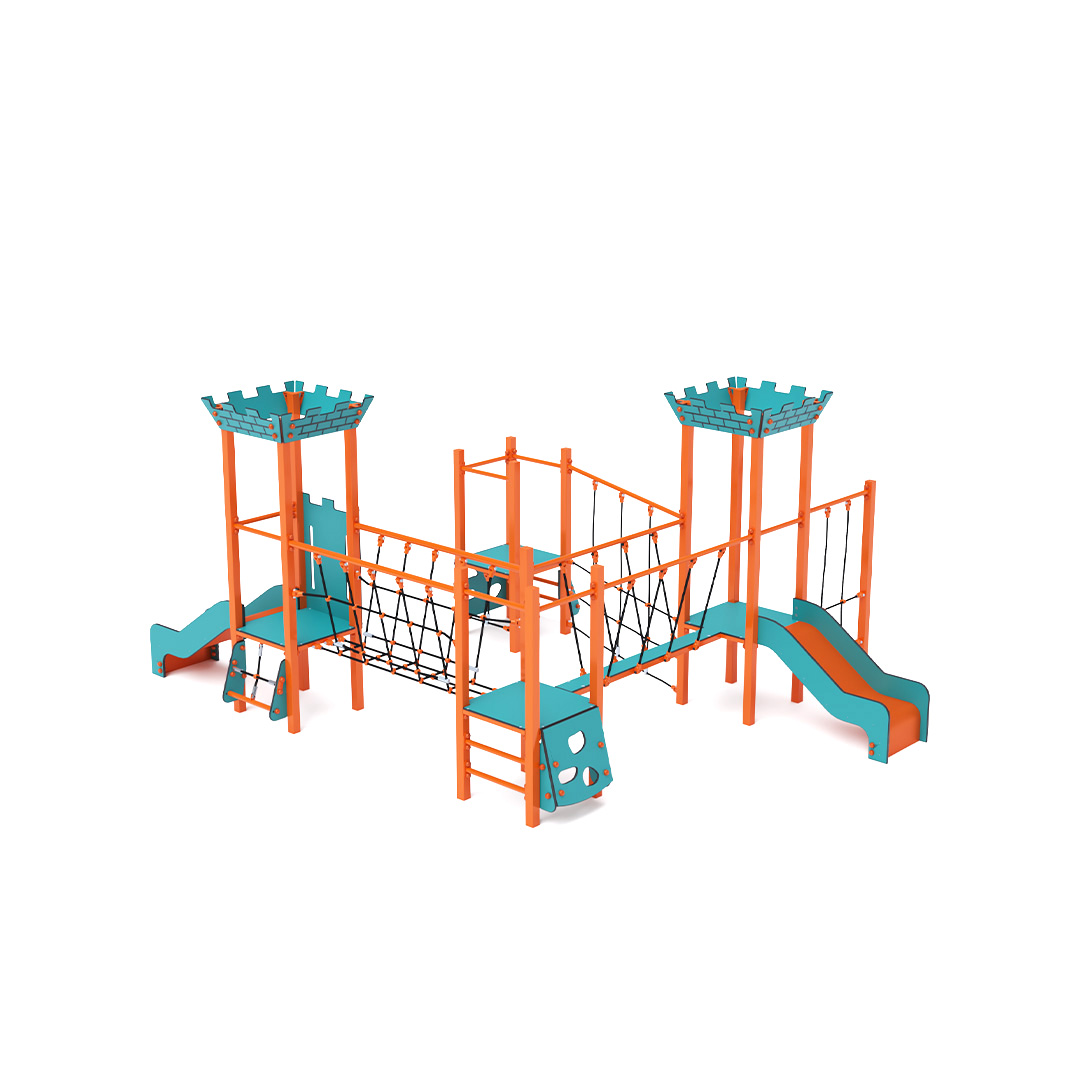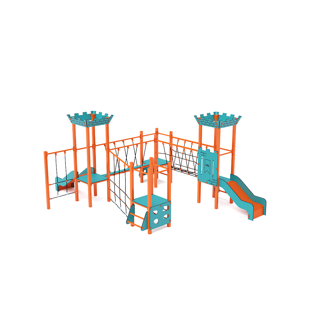 Four-tower combined mini playset. The towers are interconnected by a diagonal rope bridge, a beam bridge, and another rope bridge. Children can climb the structure using various inclined access options such as a climbing wall, a climbing ladder, or a rope ascent. There are also vertical options including a climbing wall, a ladder, and a rope ascent located outside the tower. For descent, the playset features two slides. The turquoise-orange color scheme invites play from afar. The steel structure is weather-resistant due to hot-dip galvanizing and a tough powder-coated finish. The HPL panels are chemically resistant, UV-stable – colorfast, non-toxic, recyclable, and unbreakable, preventing injuries from sharp edges or fragments. All joints are stainless steel and covered with plastic caps for enhanced durability and safety.