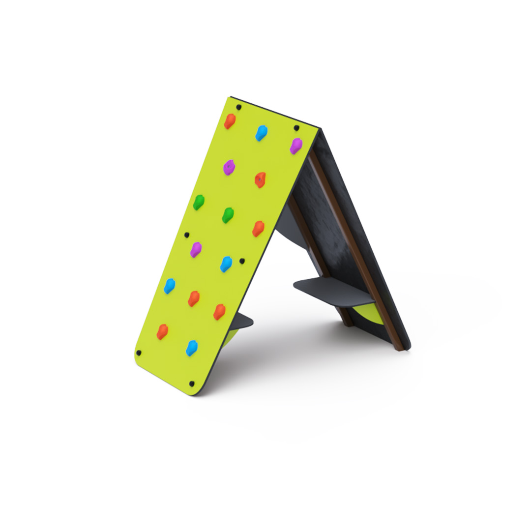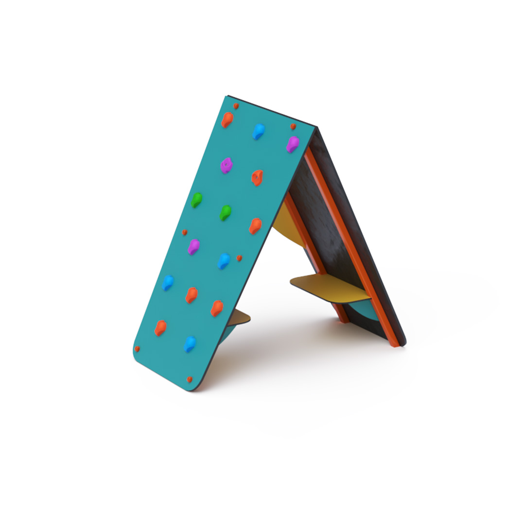Themed tent-shaped playhouse complemented with a climbing wall featuring climbing stones. The steel structure is weather-resistant due to hot-dip galvanization and durable powder coating. The HPL material used is chemically resistant, UV-resistant (color-stable), non-toxic, recyclable, and unbreakable, ensuring no risk of injury from sharp edges or fragments.