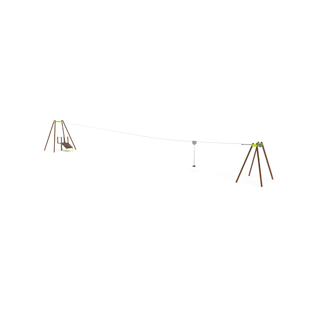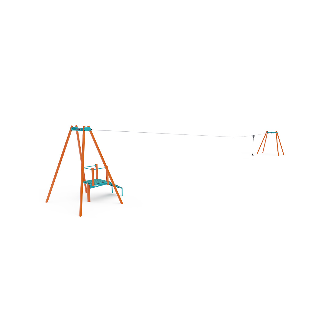 A single-track zip line with a pulley provides children with fun in the form of "flying" from one side to the other, as they sit with their legs in the air on the seat. A playground with a zip line offers a completely different dimension of play.The play element is made of hot-dip galvanized steel with high-quality surface treatment, and the joints are stainless steel covered with plastic caps to enhance safety and joint durability. The floor of the boarding platforms is made of HPL material.